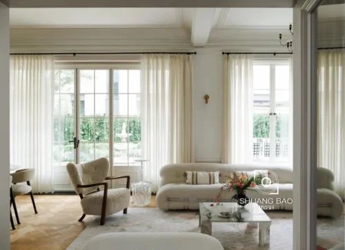 吊灯来自Flos,沙发来自Cassina,羊毛椅来自&tradition,玻璃小边几来自意大利glas,茶几来自Gubi。壁炉两侧的挂画来自艺术家文艺的国画《春风无限》和《牵丝戏》。软装的陈列不会过度刻意,在一派祥和之中,足以窥见所传递出的悠闲生活方式。落地窗让光线畅通无阻地在室内流动,将花园的美景引入室内,若隐若现的薄纱又能保护室内私密,拉上窗帘,家即可成为一个超脱城市喧嚣的内向宇宙。