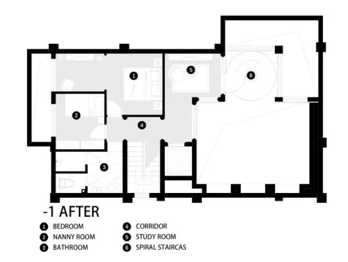 地面以下的空间原始采光条件并不理想,昏暗且潮湿,如今被改造为通透、明亮而轻盈的状态。我们设计师选择了钢板与实木混合的设计,让旋转楼梯拥有了刚柔并济的美感,这道楼梯不仅连接着不同楼层,蜿蜒向上的线条营造出庄重典雅、富有流动性的氛围,成为空间中颇具有功能性的“艺术品” 。