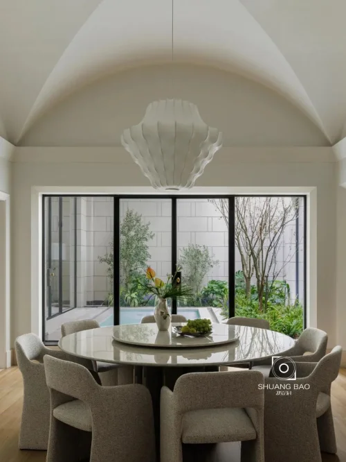 餐厅上方的穹顶设计,流畅的弧形斜面兼具浪漫与力量感。餐桌来自HC28,餐椅来自锐驰,吊灯来自丹麦Normann Phantom,花瓶与果盘来自丹麦Georg Jensen。地下室的落地效果令人满意,屋主回忆最初看到的效果图非常诧异与惊喜:“张肖老师围绕着两个天井的光源去展开各个重要的空间设置,同时还在既有房屋结构限制下,把我们喜欢的元素都巧妙融入。谁能想到原来昏暗的地下室也能拥有阳光、绿植和涌泉。”