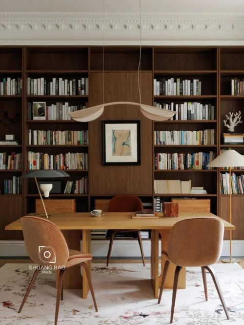 吊灯来自Flos,落地灯和椅子都来自Gubi,书桌是丹麦Menu 的Androgyne系列。满墙的胡桃木书架呈现出木材特有的天然质朴与温润,与身俱来的清雅感让书房成为感知层面的延展性容器,每一次沉浸式阅读与冥想,都是回归内心的旅程。