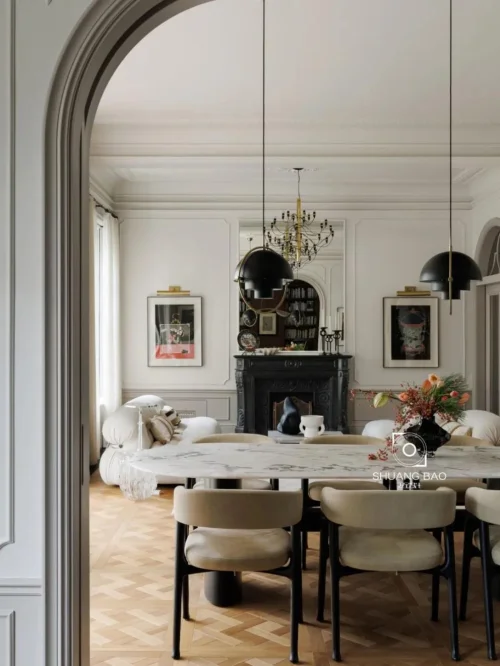 餐桌餐椅都来自Baxter,吊灯来自Gubi,挂画是艺术家文艺的国画《游园》和《潇湘月华图》。可开合的隐藏式推拉门让书房可以化身为独立空间。圆润的弧形门框让书房在敞开时柔化空间的视觉界限,带来优雅和谐的美感。