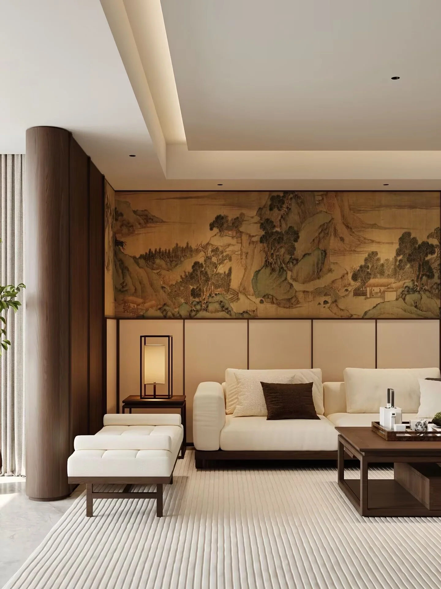 客厅那山水背景墙 往沙发一瘫,感觉下秒就能吟“江山如画”,窗外风景还来凑趣,和室内古画无缝衔接,citywalk都省了!