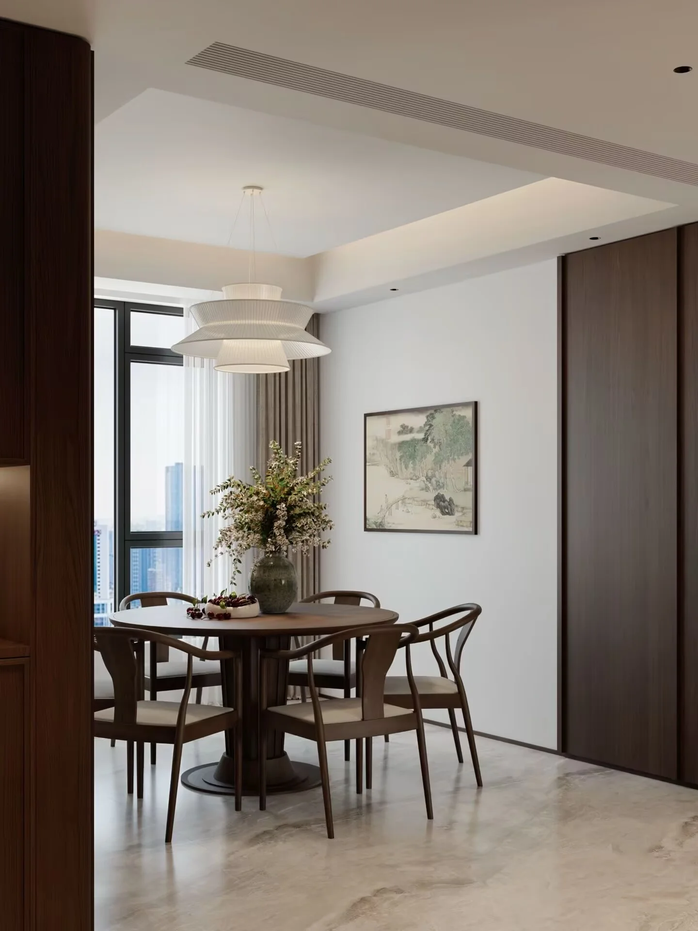 电视墙藏收纳,客厅整洁度直接拉满,朋友来以为我请了收纳大师 餐厅吊灯像朵云️ 配圆桌和复古椅,干饭都有“把酒言欢”那味,插花和古画一搭,文艺感爆棚~