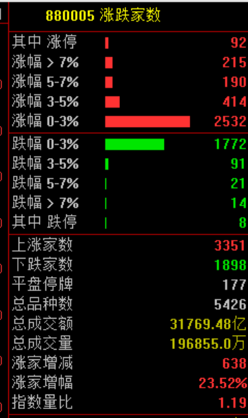 市场共3351只个股上涨,92只个股涨停,1898只个股下跌。
