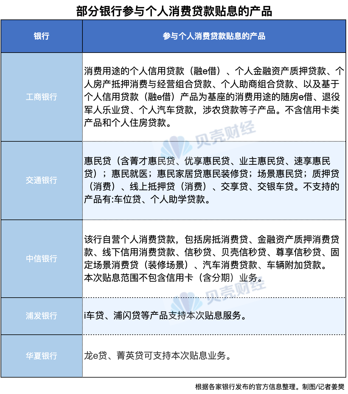 中信银行则指出,该行贴息的消费信贷产品范围包括自营个人消费贷款,涉及房抵消费贷、金融资产质押消费贷款、线下信用消费贷款、信秒贷、贝壳信秒贷、尊享信秒贷、固定场景消费贷(装修场景)、汽车消费贷款、车辆附加贷款。