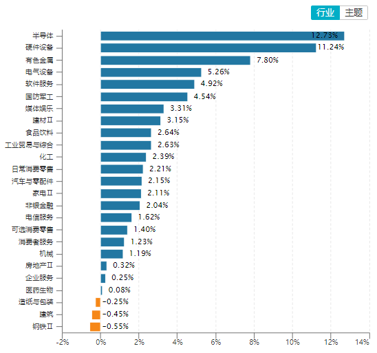 从行业板块表现来看,半导体、硬件设备、有色金属、软件服务和军工等涨幅居前。