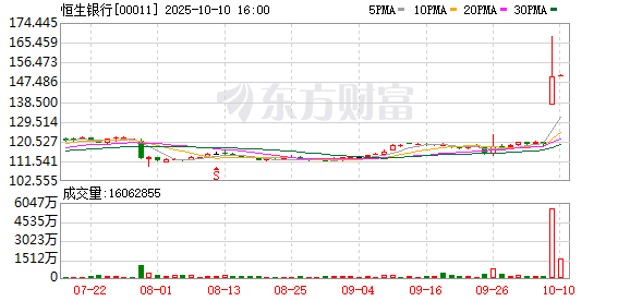 截至10月10日收盘,恒生银行上涨0.4%,报150.40港元/股,汇丰控股下跌0.48%,报103.50港元/股。
