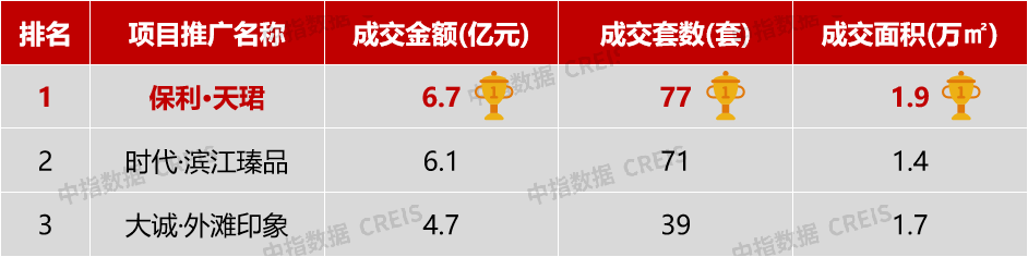 成交中,保利·天珺勇夺成交金额、成交套数和成交面积的“三冠王”。