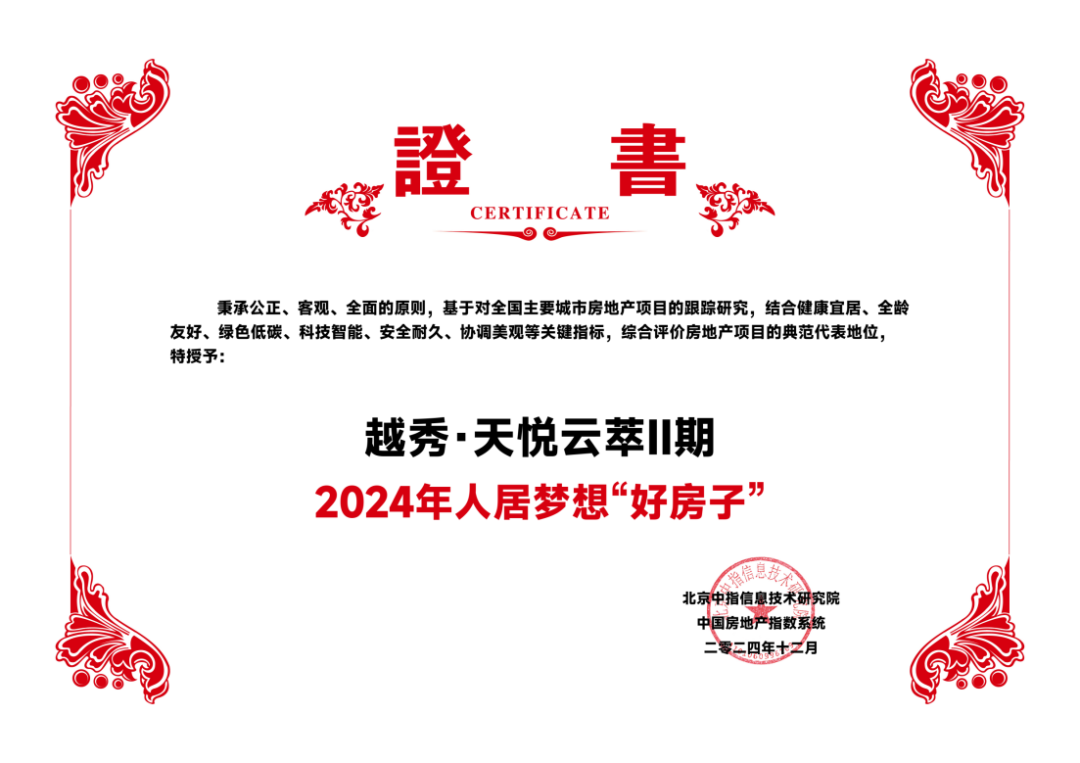 越秀·天悦云萃Ⅱ期 2024年人居梦想“好房子”荣誉证书