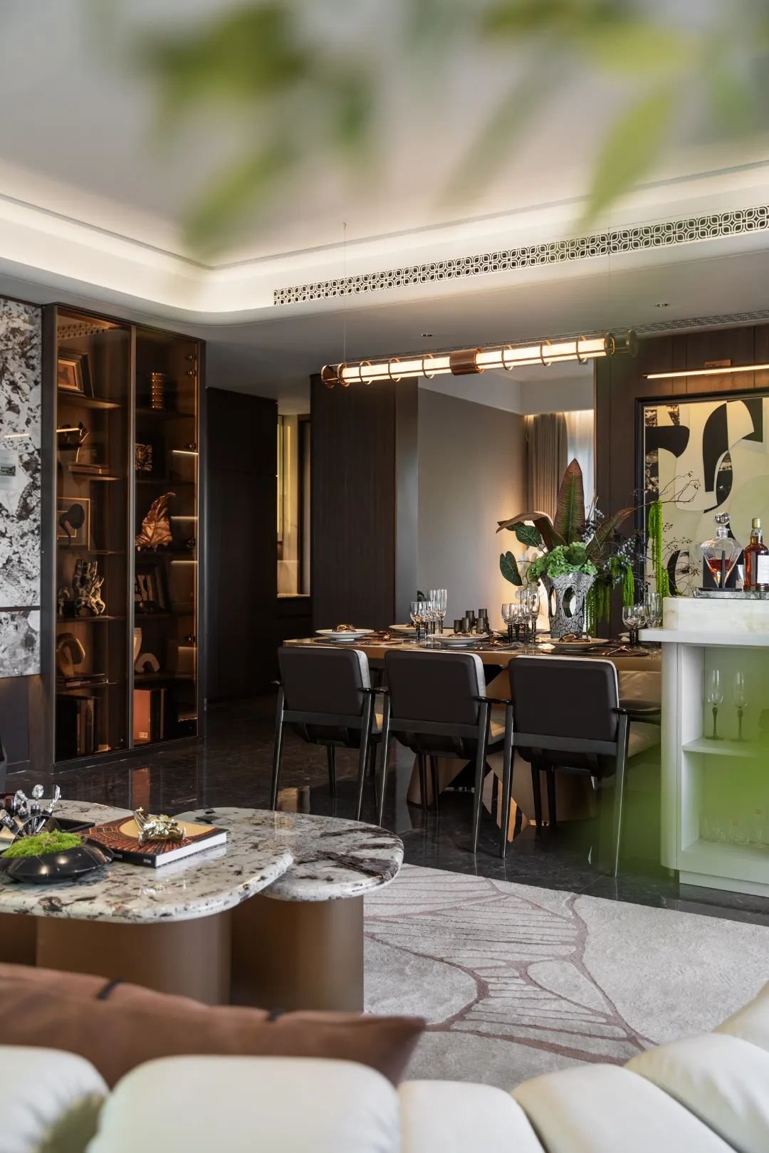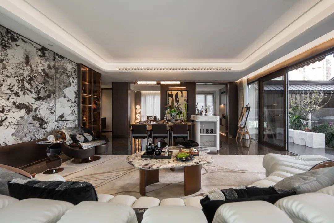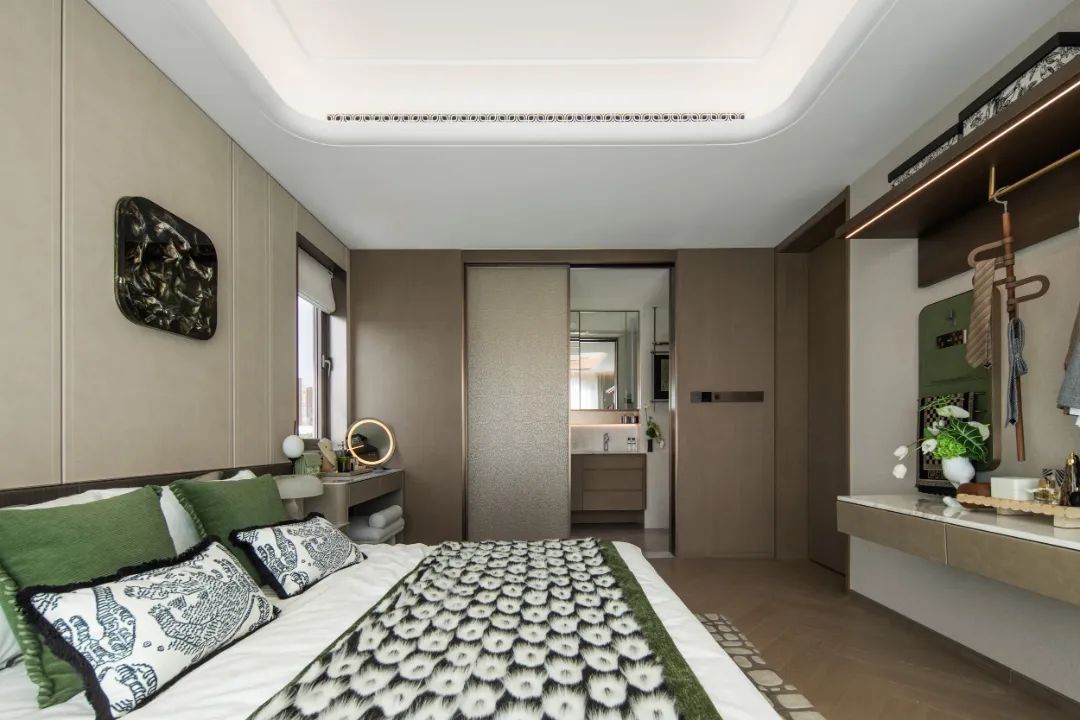 空间细节奢造:外开入户子母门,入户门锁智能联动,户内门全部到顶,入户玄关皆采用定制岩板和石材。玄关处配置800库,厨房带空调、家政间预留机器人上下水、主卫配置美妆冰箱与半嵌入式浴缸,配合方太/唯宝/科勒/高仪等国际品牌卫厨体系,辅以海纳百川等特制奢石,让科技隐于无形,奢居落于日常。