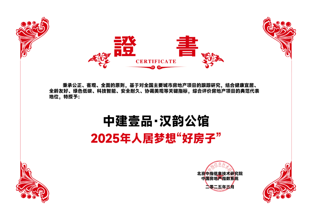 中建壹品·汉韵公馆项目凭借着优异的产品力、强大的品牌实力,荣获『2025年人居梦想“好房子”』。