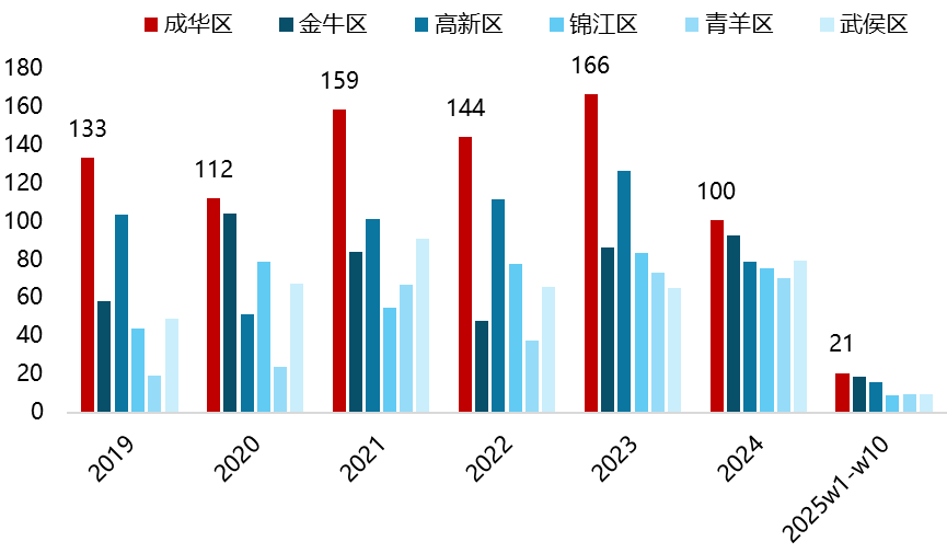 近六年来,成华区商品住宅成交面积始终维持在百万方量级。中指数据显示,2019-2024年间该区域年均成交面积达140万㎡,连续六年位居成都主城区首位。至2025年第一季度,成华区仅用10周时间便实现20.6万㎡认购成交面积,市场份额进一步攀升至25%。这种稳定的市场表现,源于市场“主城回归”情绪的持续推进凭借成熟配套与规划兑现,成华成为改善客群的确定性选择。