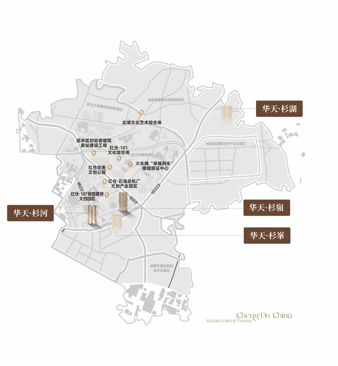 当大多数房企还在用“环线逻辑”丈量土地价值时,华天文旅早已将目光投向更深处:建设路与万象城人流如织、东郊记忆的文创IP声量裂变、龙潭新城的政务中心加速落位……这些被城市发展托举的极核板块,才是华天文旅的真正战场。杉河踞守东二环极核,左手紧握建设路商圈二十年成熟配套,右手直抵杉板桥商圈的艺术与商业浪潮,日均超10万客流在此涌动,织就成都主城罕有的消费磁场。而杉嶺的落子亦显战略眼光——占据“金色中环”咽喉要地,与东郊记忆文创产业园仅一街之隔。这里不仅是城市更新的样板,更是文创产业集群的爆发地,为住宅注入强劲的产业动能。即将入场的杉峯则占位杉板桥路南侧核心,踞守东郊记忆艺术区与建设路商圈黄金交汇带;杉湖傲居成华区东三环龙谭寺板块,占位成都最大规模双站TOD都会芯核。