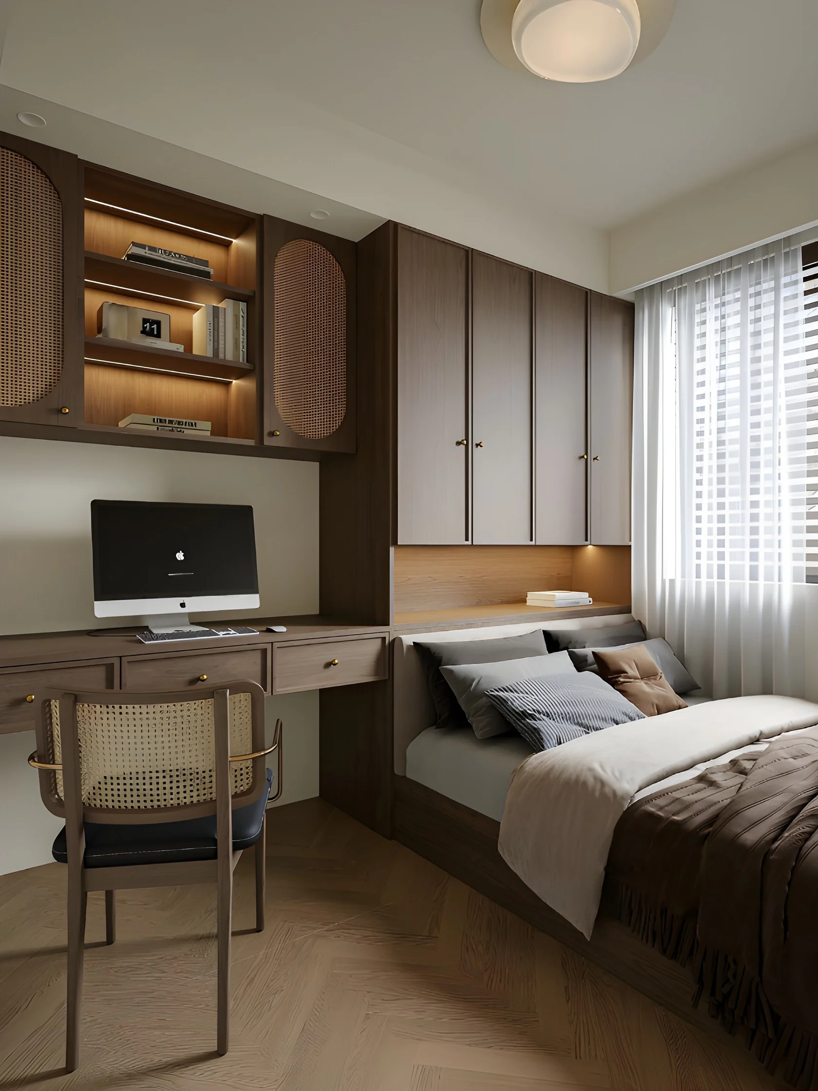 卧室整体呈现出一种温馨、自然的氛围,深色木质床具搭配简约的床上用品,显得质朴而有质感 。黄铜色与木质结合的吊灯,增添了复古与精致感。这种风格偏向于现代美式或简美风格,注重材质的天然质感,色彩搭配和谐,营造出舒适放松的睡眠环境。