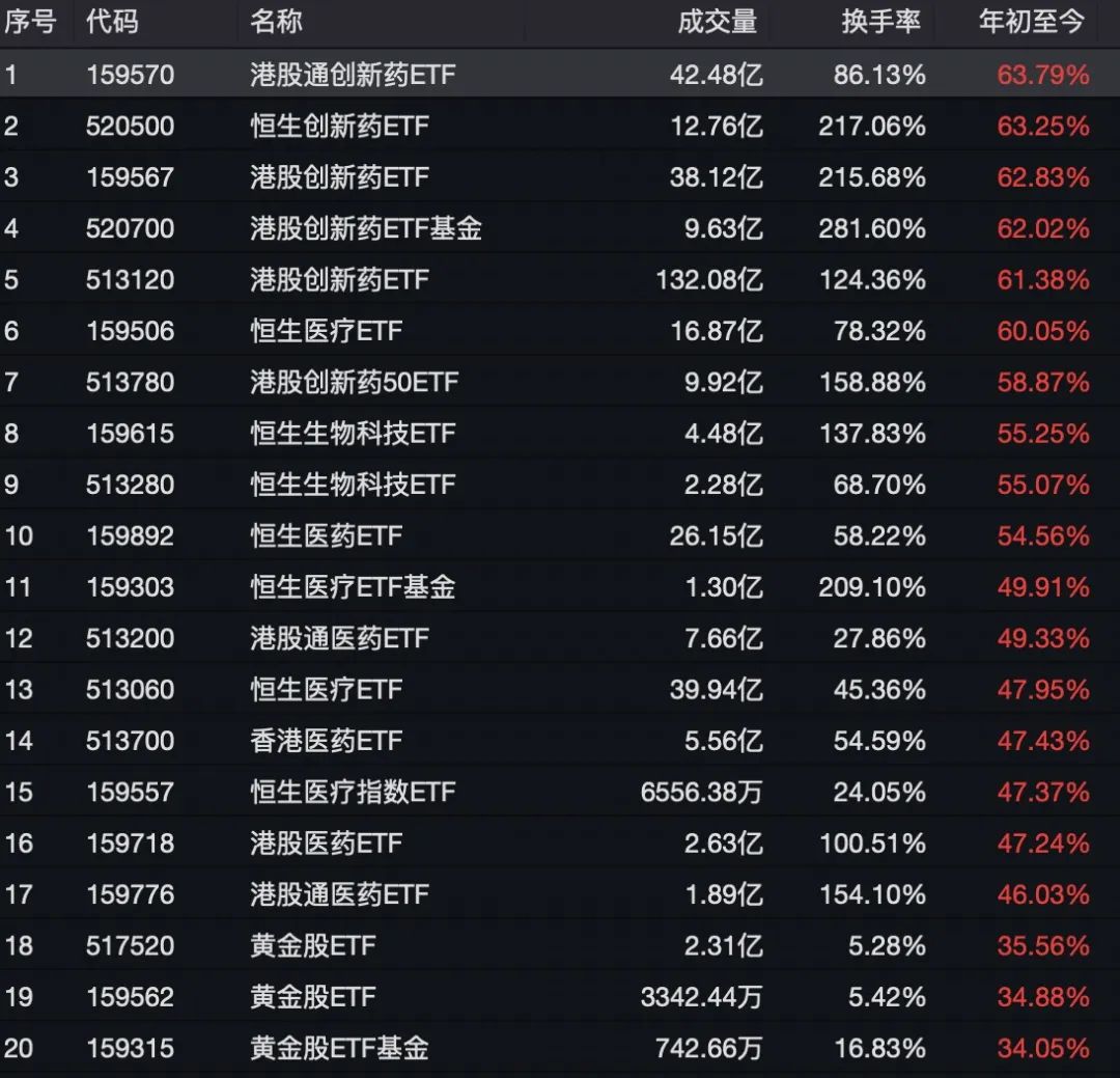 比如,广发港股创新药ETF全日成交132.06亿元,刷新历史纪录,换手率达到124.36%;汇添富港股通创新药ETF当日成交42.48亿元,也创历史新高,换手率达到86.13%;银华港股通创新药ETF日成交量达到创纪录的38.12亿元,换手率为215.68%。