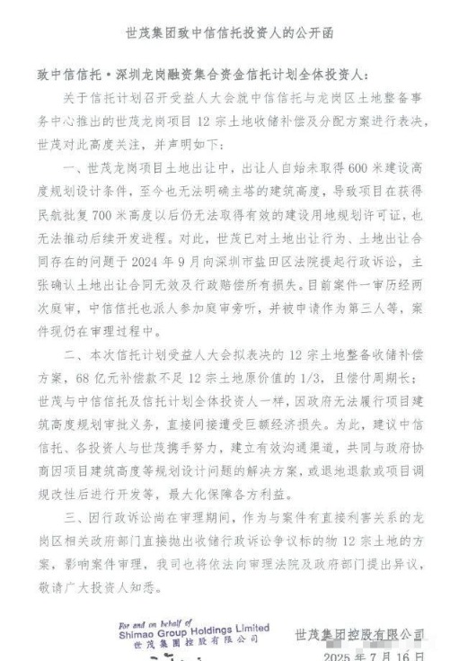 公开函表示:“68亿元补偿款不足12宗土地原价值的1/3,且偿付周期长,建议中信信托、各投资人与世茂携手努力,协商解决方案。”