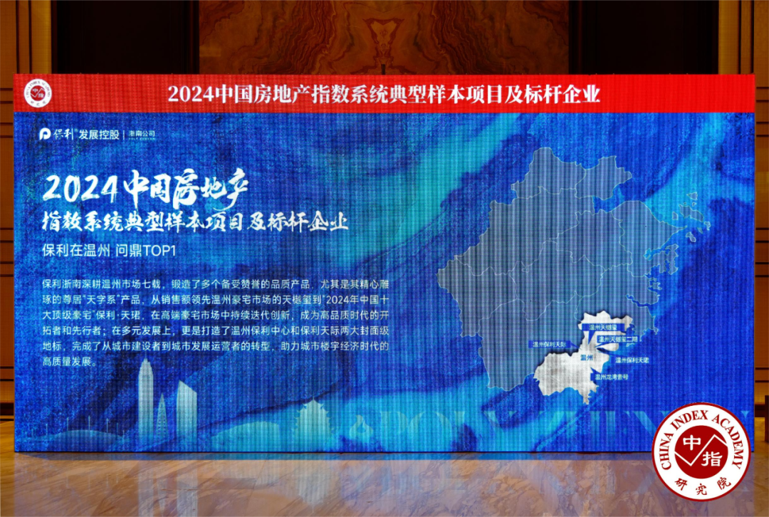 2024年12月19日,由北京中指信息技术研究院主办,中国房地产指数系统、中国物业服务指数系统承办的“2024中国房地产大数据年会暨2025中国房地产市场趋势报告会”在北京召开。经过综合评定,基于保利浙南在温州市场的优异经营能力、发展潜力、品牌影响力等关键性指标,荣膺“2024温州市房地产市场地位领先企业”。