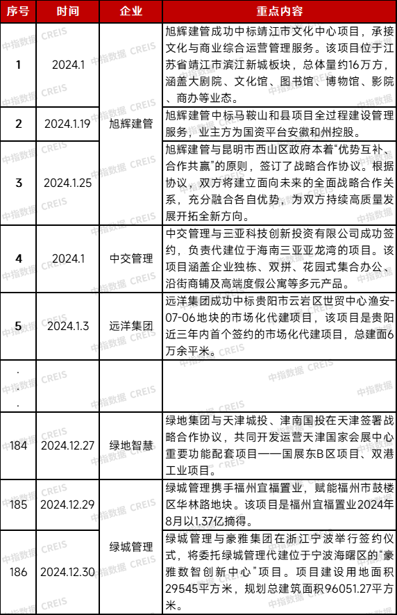 2024年,房地产代建企业在代建领域典型事件持续增加,无论是项目拓展还是战略合作,均为近年来最高。通过对全年事件梳理,代建企业典型事件主要由以下几个方面:其一,多方合作,不断拓展代建业务。绿城管理、蓝城集团、金地管理、旭辉建管等多家代建企业期内大力加强战略合作,主要方向包括地方城投、地方政府、资管公司和部分民营房企;部分代建企业与地方国企合作,实现强强联合。其二,获取新的代建项目,积累代建实力。全年,代建企业代建新签约项目类型更加丰富,除传统住宅开发外,旭辉建管中标文化中心,国贸地产中标产业园区,远洋建管城市更新项目等。其三,战略调整,成立代建平台公司或转型轻资产业务。招商蛇口、金科集团均成立代建平台;迪马股份将逐步向轻资产代建、代销及代管理方向转化。