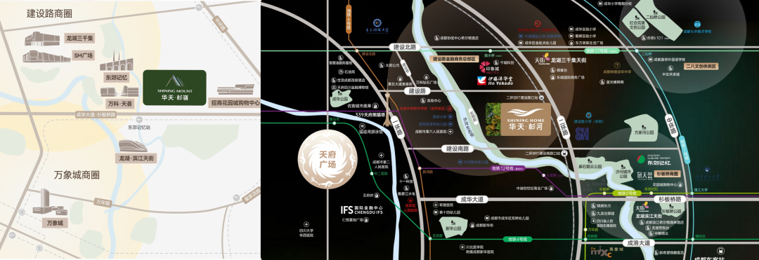 当大多数房企还在用“环线逻辑”丈量土地价值时,华天文旅早已将目光投向更深处:建设路与万象城人流如织、东郊记忆的文创IP声量裂变、龙潭新城的政务中心加速落位……这些被城市发展托举的极核板块,才是华天文旅的真正战场。杉河踞守东二环极核,左手紧握建设路商圈二十年成熟配套,右手直抵杉板桥商圈的艺术与商业浪潮,日均超10万客流在此涌动,织就成都主城罕有的消费磁场。而杉嶺的落子亦显战略眼光——占据“金色中环”咽喉要地,与东郊记忆文创产业园仅一街之隔。这里不仅是城市更新的样板,更是文创产业集群的爆发地,为住宅注入强劲的产业动能。即将入场的杉峯则占位杉板桥路南侧核心,踞守东郊记忆艺术区与建设路商圈黄金交汇带;杉湖傲居成华区东三环龙谭寺板块,占位成都最大规模双站TOD都会芯核。