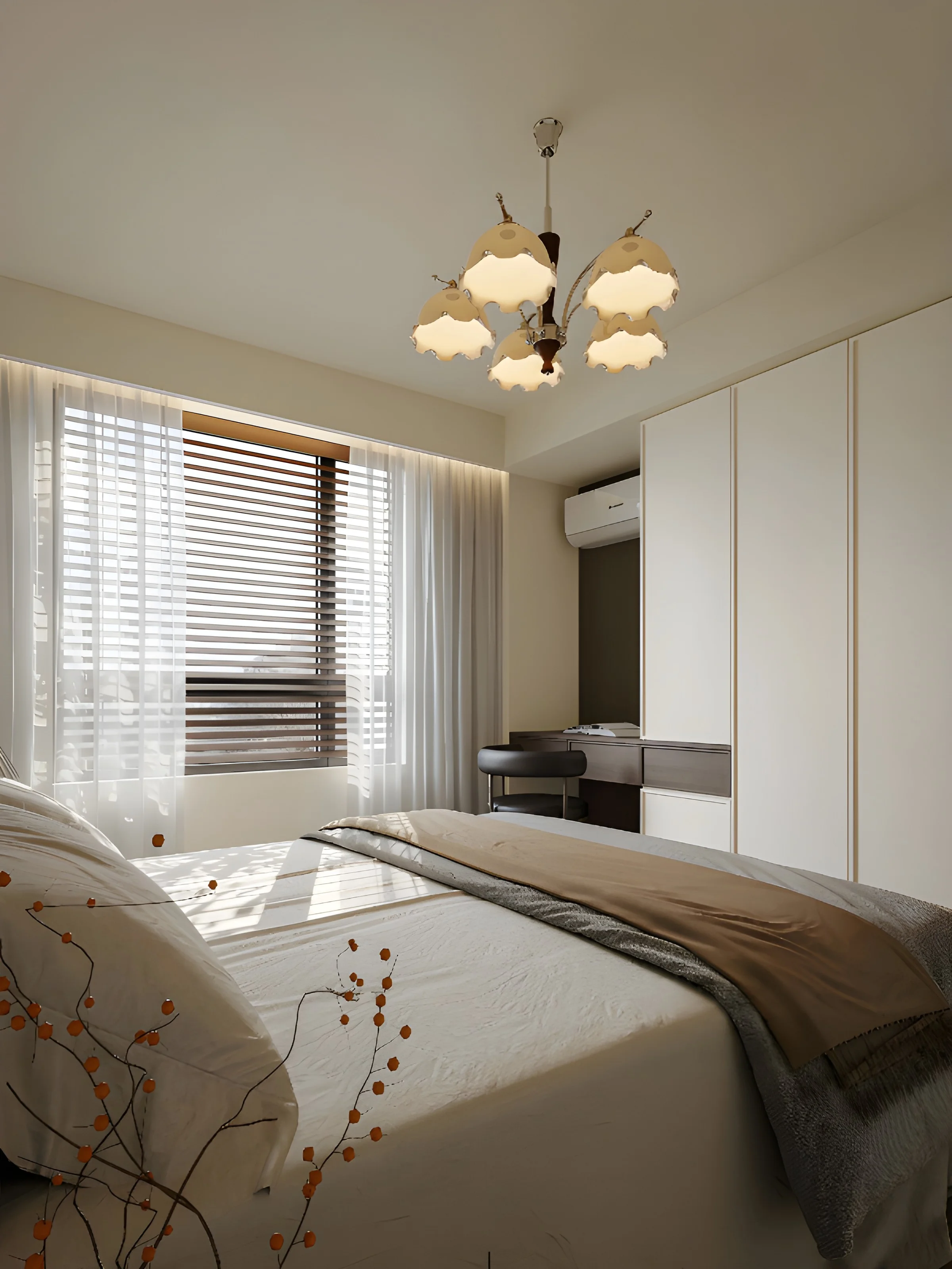 卧室整体呈现出一种温馨、自然的氛围,深色木质床具搭配简约的床上用品,显得质朴而有质感 。黄铜色与木质结合的吊灯,增添了复古与精致感。这种风格偏向于现代美式或简美风格,注重材质的天然质感,色彩搭配和谐,营造出舒适放松的睡眠环境。